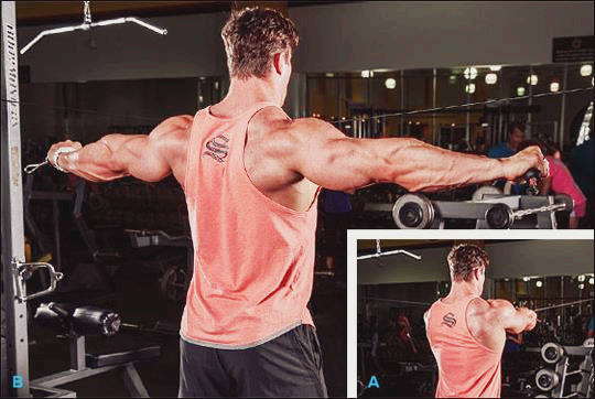 단순히 케이블을 잡아 당기는 것처럼 보이지만, 팔의 힘이 아닌 후면의 삼각근의 힘을 최대한 사용하는 것이 중요한 동작입니다.