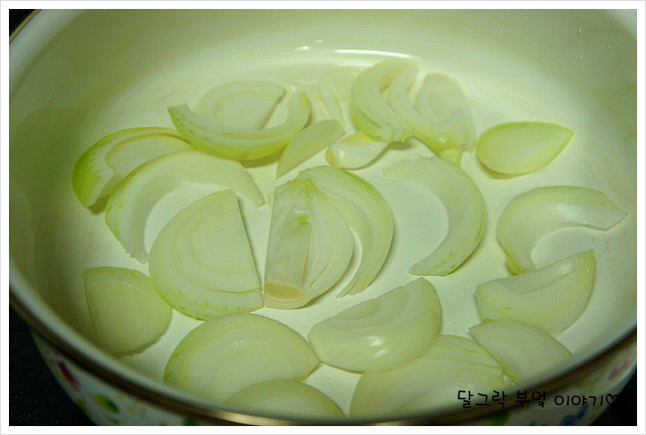전골냄비 바닥에 양파를 먼저 골고루 갈아주고,