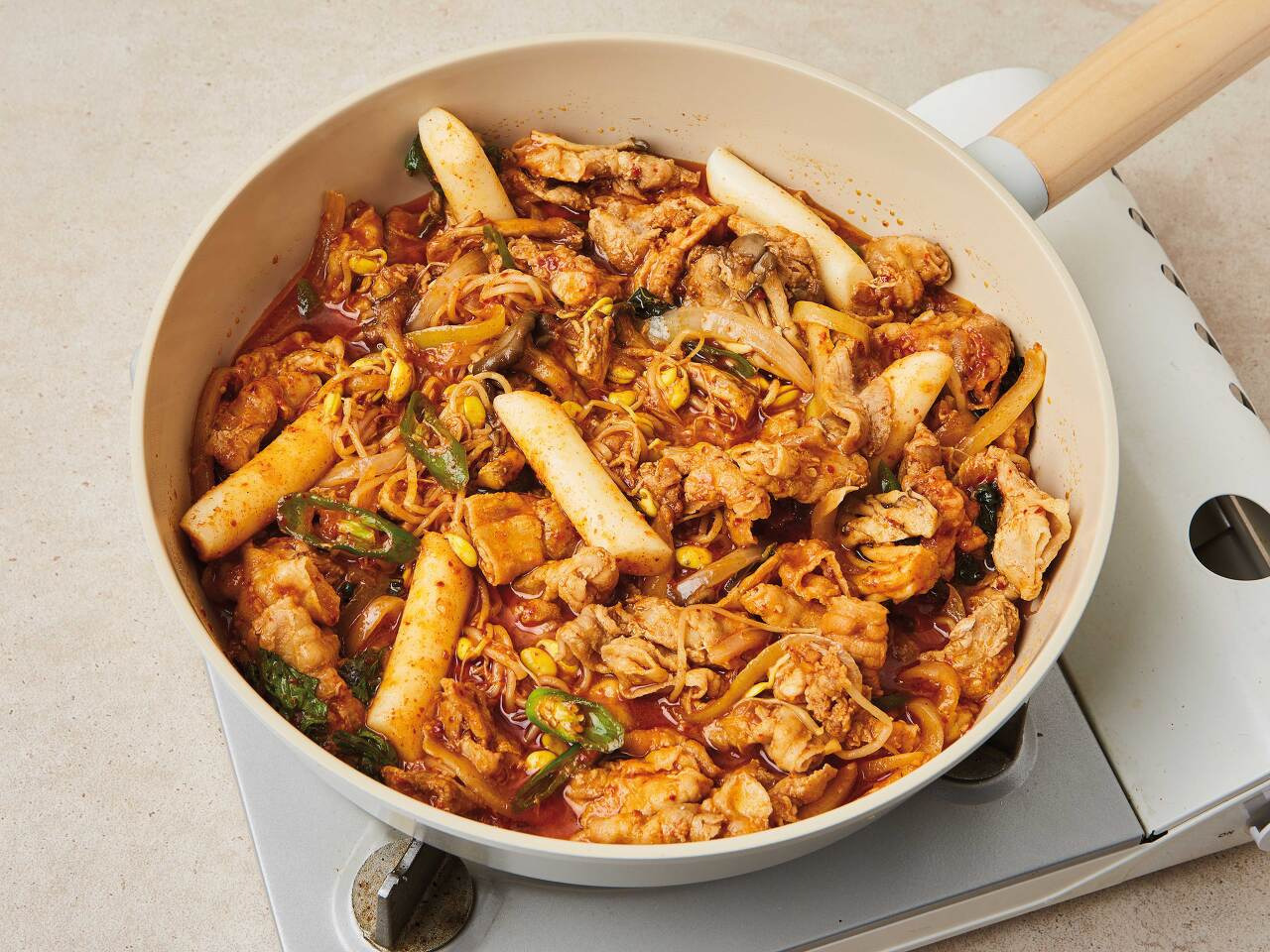 5. 뚜껑을 열고 떡볶이떡을 넣어 고루 저은 뒤 센 불로 6분간 더 익히고,