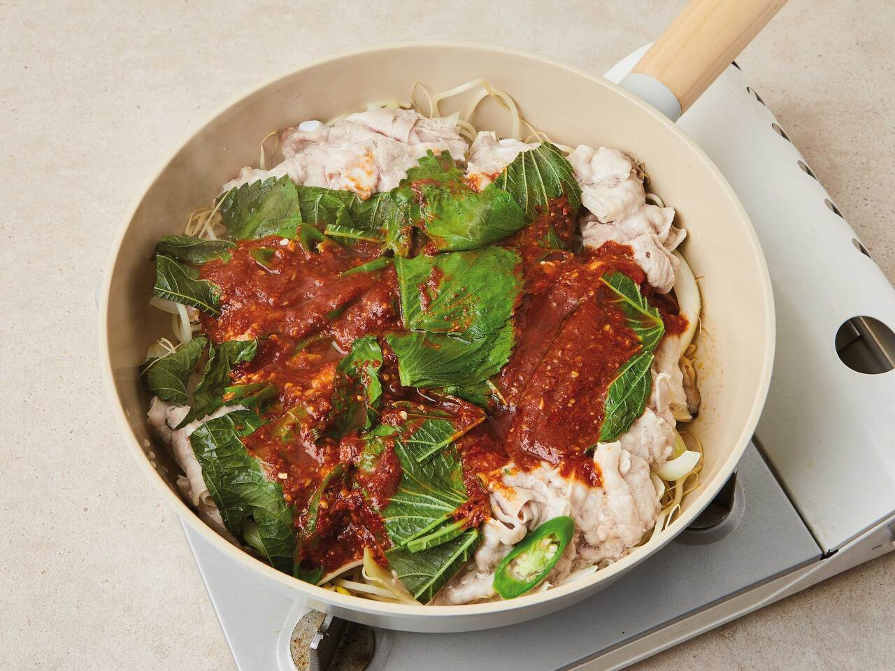 4. 넓은 팬에 콩나물 → 양파 → 느타리버섯 → 대패삼겹살 → 깻잎 → 청양고추 → 양념장 순으로