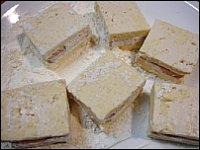 두부와 두부사이에 스팸을 넣고 반을 자른후에 자른부분과 두부가장자리에 부침가루를 묻여준다.